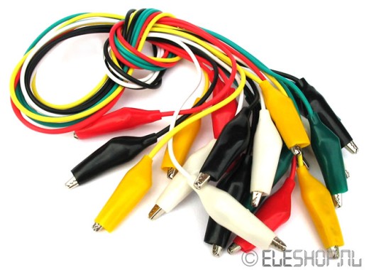 Набор из 10 кабелей 5 разных цветов. Каждый кабель оснащен зажимом типа «крокодил» с обеих сторон.