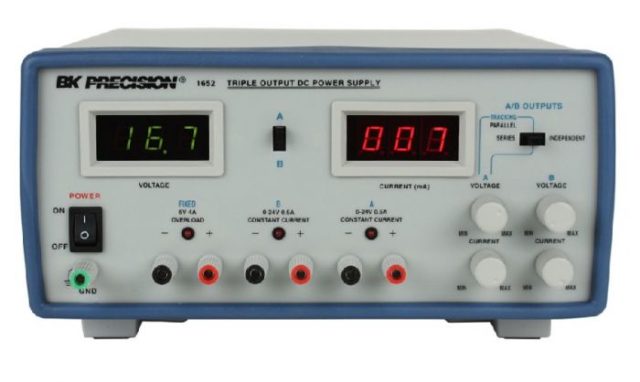 The BK 1652 Triple Output DC Power Supply has two 0 to 24 VDC outputs capable of supplying 0 to 500mA, and one fixed 5 VDC output capable of supplying up to 4A. Connect outputs in series for higher voltage or connect in parallel for higher current output (switch selectable). The 1652 voltage and current metering is provided by two, three digit LED displays. This unit is fully short circuit, overload, and reverse polarity protected.