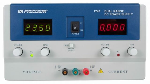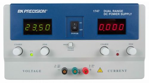 BK Precision 1747 — это двухдиапазонный источник питания постоянного тока общего назначения. Этот источник питания имеет два диапазона и может выдавать более высокое напряжение при более низком диапазоне тока или более высокий ток при более низком диапазоне напряжения. BK Precision 1747 обеспечивает диапазоны 0-35 В, 0-10 А и 0-60 В, 0-5 А. Напряжение и ток регулируются с помощью ручек грубого и точного управления. Два больших светодиодных индикатора непрерывно контролируют выходное напряжение и ток. Блоком питания можно управлять локально с передней панели или дистанционно через интерфейс RS-232.