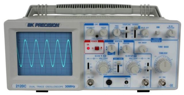 The BK Precision 2120C is a dual trace oscilloscope that offers high performance at a low price. Most competitor’s entry level oscilloscopes have a 20 MHz bandwidth, while the BK Precision 2120C has a bandwidth of 30 MHz.