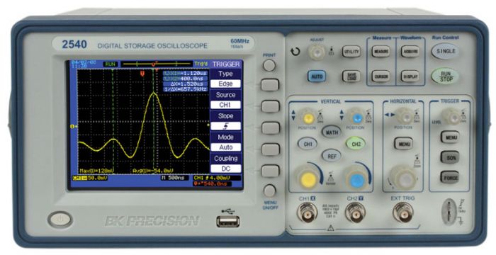 The BK Precision 2540 dual channel Digital Storage Oscilloscope delivers an unmatched combination of performance and value. Analog style controls combined with an Auto measurement function make these oscilloscopes easy to use. Advanced features such as FFT function, digital filtering, waveform recorder, delayed sweep/zoom, mask testing and automatic measurements provide you with powerful tools to debug your circuits.
