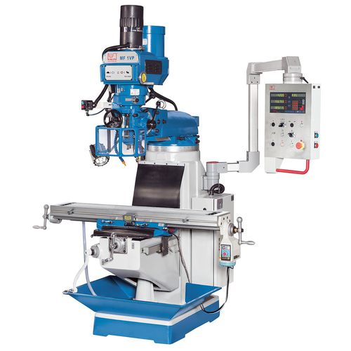 The design of the multi-purpose milling machine series MF1 is the best-selling in the world and indispensable in many workshops. The X-axis is equipped with an infinitely variable feed and the swiveling vertical milling head with belt drive offers a wide speed range for machining steel to non-ferrous metals. The automatic quill feed and pneumatic tool clamping are also part of the standard accessories, as is the mounted position indicator. The entire series is ideal for repair workshops as well as training and production departments. • Swiveling, tiltable cutter head with quill feed • Pneumatic tool tightening system • Milling head swivels in 3 axes • Extensive standard equipment • Speed is changed by shifting the 2-step drive motor transmission, or by selecting the desired gear ratio at the drive belt (4 speeds per gear) • Automatic table feed, type TV 1000 on X and Y, can easily be retrofitted • Head swivels on 3 axes: swivel r + l ± 90°, tilt forward + reverse ± 45°, rotation on the column ± 45° • Dovetail guides, hardened, adjustable • 3 automatic drill feeds • Manual coarse feed for quill, with change-over for manual fine feed • Quill with automatic micrometer depth stop • Spindle mount ISO 30 • Reversing switch for forward reverse rotation • Manual spindle brakes • Pneumatic tool clamping • 3-axis position indicator, coolant system, and LED work lamp (included in standard equipment)