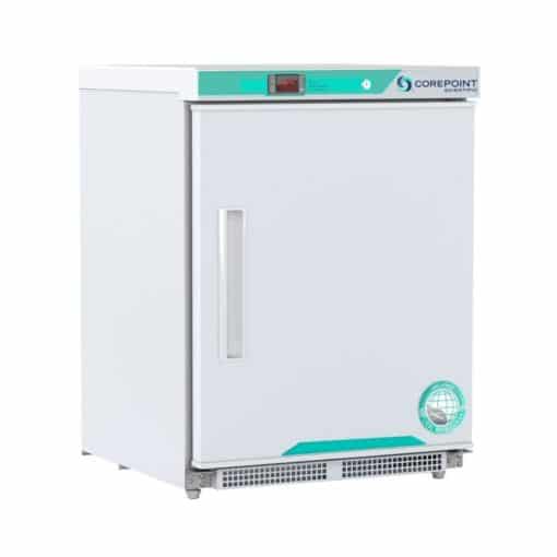 Product Description Corepoint Scientific White Diamond Series Undercounter Freezer Built-In 4.2 Cu. Ft. Capacity One solid swing door, right hinged* Microprocessor temperature controller Digital temperature display Audible and visual high and low temperature alarms 2 probes, 1 in air and 1 in sample bottle Remote alarm contacts Adjustable operating temperature range: -15C -25C Two fixed shelves Keyed door lock Magnetic door gasket for positive seal Recessed door handle Leveling legs Probe access port (3/8) Powder coat exterior High density urethane foam cabinet and door insulation HFC-free refrigerant (R600a), foam insulation and packaging Three year parts and labor warranty, plus an additional two year compressor parts only warranty Pyxis, Omnicell and AcuDose RX compatible Exterior dimensions: 23 ¾, W x 24 ½, D x 31 15/16 H Manual defrost 115V, 60 Hz, 1.5 Amps, 1/8 HP ADA compliant UL/C-UL listed Shipping weight: 133 lbs. *This product is available left hinged
