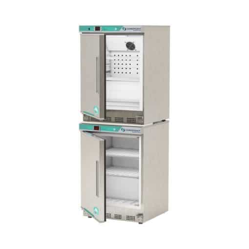 Product Description Corepoint Scientific White Diamond Series Refrigerator & Freezer Combination-LEFT HINGED 9 Cu. Ft. Capacity (4.5 Ref./4.2 Freezer) Two stainless steel exterior swing doors, left hinged, not reversible Microprocessor temperature controller, refrigerator and freezer Digital temperature display with sample simulated probe, refrigerator and freezer Adjustable operating temperature range: Refrigerator: 1C 10C, Freezer:-15C -25C Audible and visual high and low temperature alarms, refrigerator and freezer Remote alarm contacts, refrigerator and freezer 2 adjustable/1 fixed shelves refrigerator/2 fixed shelves freezer with guard rails on back in Refrigerator to prevent product from being pushed against back wall Back wall evaporator cover, Refrigerator Forced draft circulation Refrigerator Keyed door locks Magnetic door gasket for positive seal Recessed door handles Leveling legs Stacking kit LED interior lights Probe access port (3/8), 2 ea. (1 for refrigerator/1 for freezer) Stainless steel exterior HFC-free refrigerant (R600a), foam insulation and packaging Three year parts and labor warranty, plus an additional two year compressor parts warranty Exterior dimensions: 23 ¾, W x 24 ½,D x 66 ¾,H Manual defrost freezer / cycle defrost refrigerator 115V, 60 Hz, 1.74 Amps Refrigerator, 1.5 Amps Freezer, 1/8 HP Refrigerator and Freezer UL/C-UL listed Shipping weight: 266 lbs. *Please note this unit requires 2 outlets.
