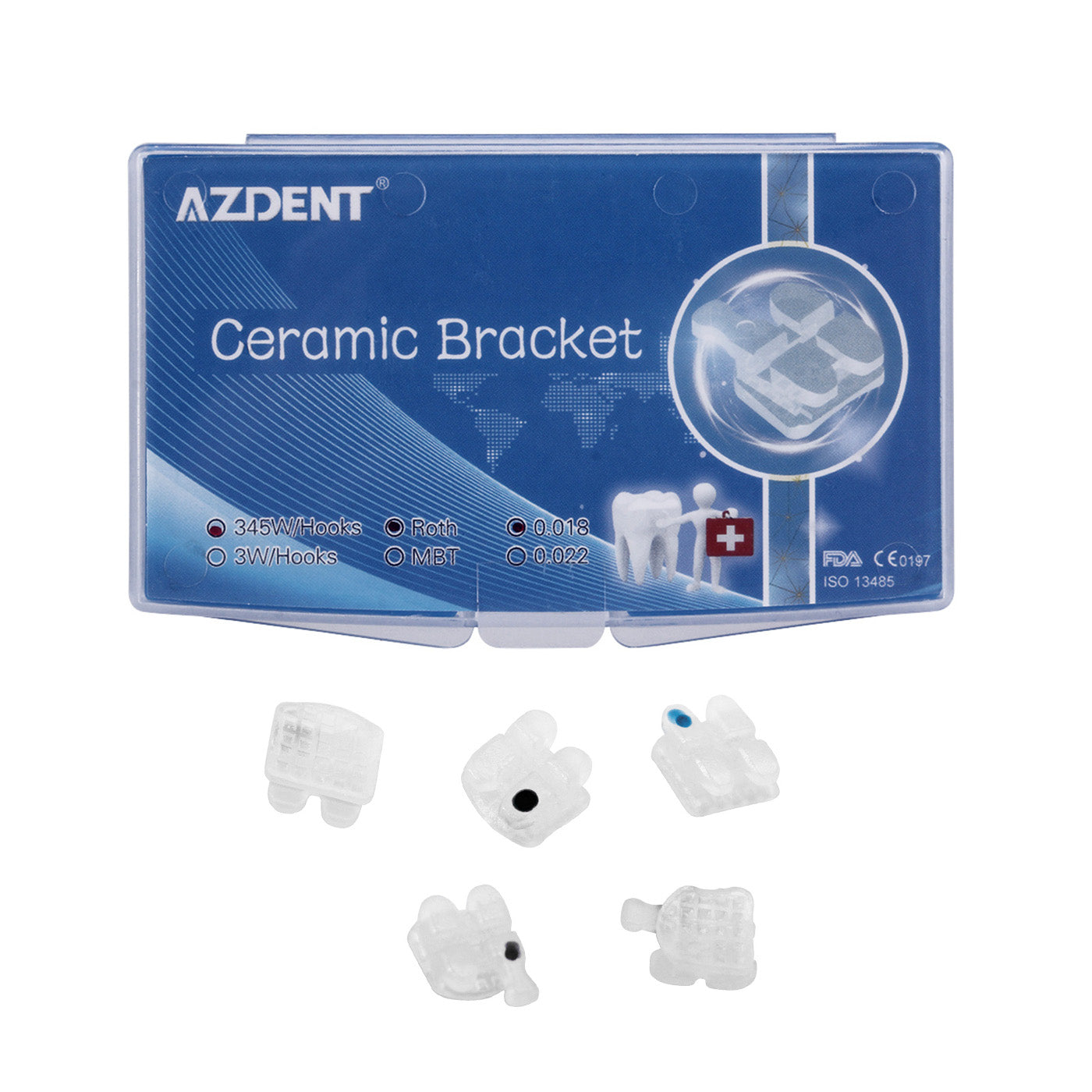 AZDENT Dental Orthodontic Ceramic Bracket Braces Roth 0.018 Hooks On 345 20pcs/Box. It»s with the latest CIM ( Ceramic Micro Injection Molding) technology system. The slot are diamond cut. The color is closed to natural teeth. This Ceramic bracket doesn»t contain any metal material, applicable to the patients who allergic to metal material.