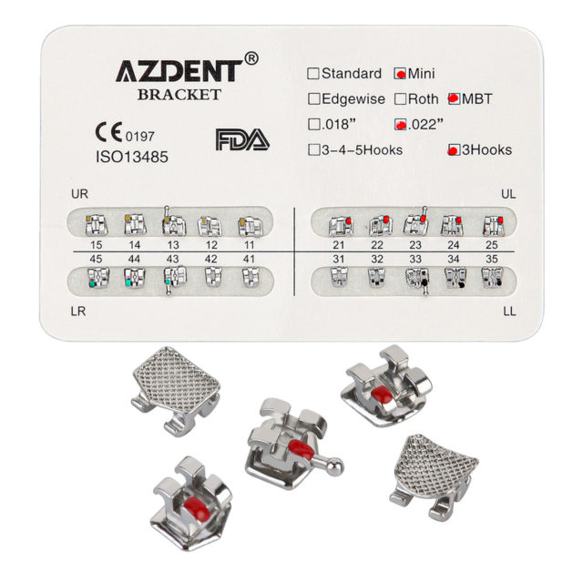 AZDENT Dental Metal Brackets Mini MBT Slot .022 Hooks on 3 20pcs/Pack. Used for orthodontic teeth. Accurate placement, color coded ID system, true straight archwire system, ease of use, easy to replace arch wire and ligate, 80 gauge mesh base, low profile patient comfort.
