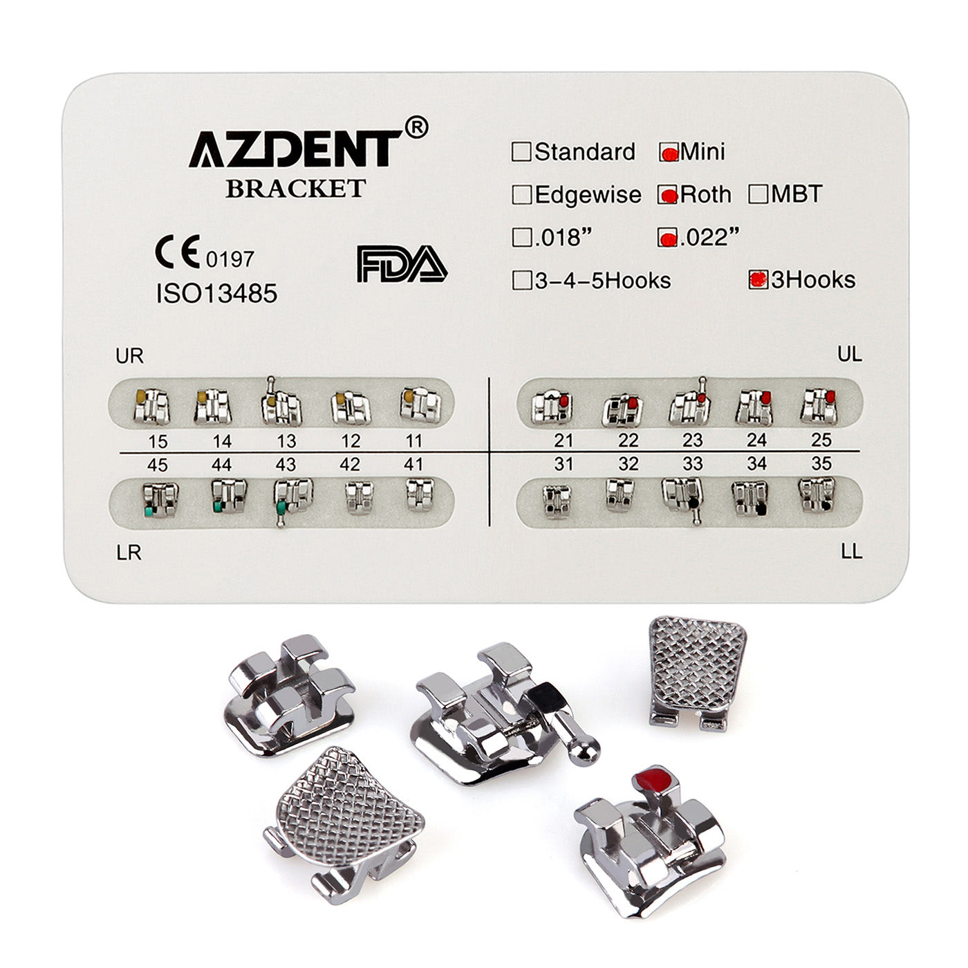 AZDENT Dental Metal Brackets Mini Roth Slot .022 3Hooks 20pcs/Pack. Used for orthodontic teeth. Accurate placement, color coded ID system, true straight archwire system, ease of use, easy to replace arch wire and ligate, 80 gauge mesh base, low profile patient comfort.