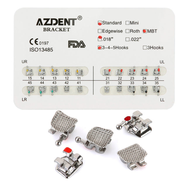 AZDENT Dental Metal Brackets Standard MBT Slot .018 345Hooks 20pcs/Pack. Used for orthodontic teeth. Accurate placement, color coded ID system, true straight archwire system, ease of use, easy to replace arch wire and ligate, 80 gauge mesh base, low profile patient comfort.