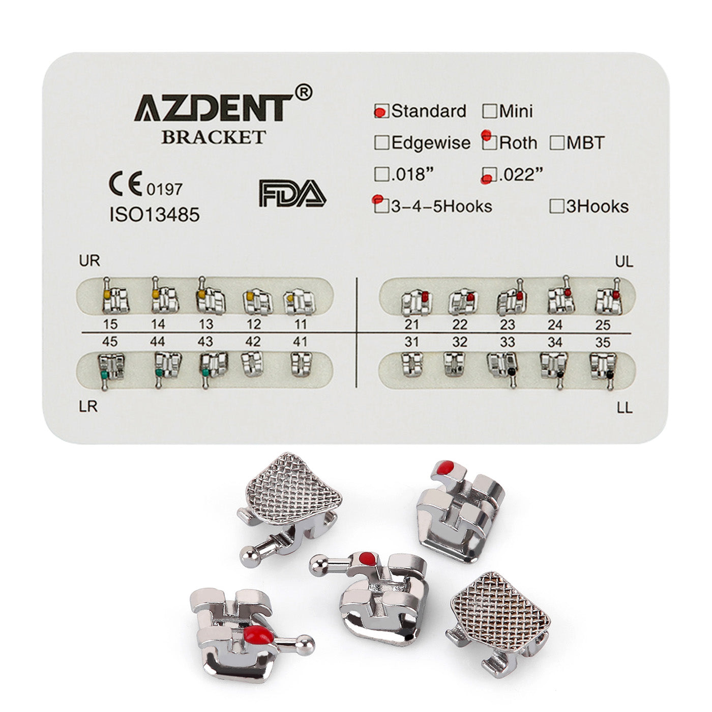 AZDENT Dental Metal Brackets Standard Roth Slot .022 Hooks on 345 20pcs/Pk. Used for orthodontic teeth. Accurate placement, color coded ID system, true straight archwire system, ease of use, easy to replace arch wire and ligate, 80 gauge mesh base, low profile patient comfort.