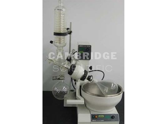 The Buchi R-124 Rotary Vap System includes poly-coated out trap and inner trap “CR” glassware, evaporating and receiving flasks and the Buchi B-481 Heating Bath. The digital heating bath can be adjusted from +20° to 100°C. Its modular construction makes it possible to configure units with different glassware assemblies. The R-124 offers a speed range of 20 to 240 rotations per minute with a power consumption of 37 watts. The R-124 features a LCD digital display with variable analog controllers and an adjustable hydraulic height control for ultimate precision. Waterbath and glassware available.