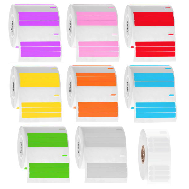 Rectangular and circular and rectangular (2 across) labels in stacks of 3 in various colours available on notched rolls compatible with DYMO label writers.