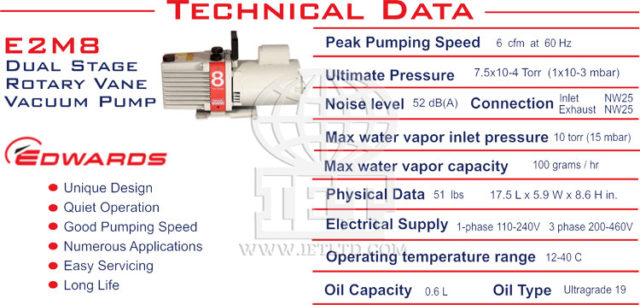 Refurbished Edwards E2M8 Dual Stage Rotary Vane Mechanical Vacuum Pump. The Edwards 8 E2M8 has superior vapor handling capabilities, while operating quietly. They are very reliable and have accessories to match any application. Applications Include use with Refrigeration dehydration, Brake line evacuation, Epoxy degassing, Sterilization, Mass spectrometry, Vacuum ovens, Lasers, Backing combinations, Thin film coating, Vacuum distillation, Freeze drying, Space research and other vacuum processes. The Edwards 8 E2M8 vacuum pumps have a pumping speed displacement at 60Hz of 6 CFM and an ultimate pressure of 7.5 X 10 -4 Torr. Please contact us for complete Edwards 8 pump details.