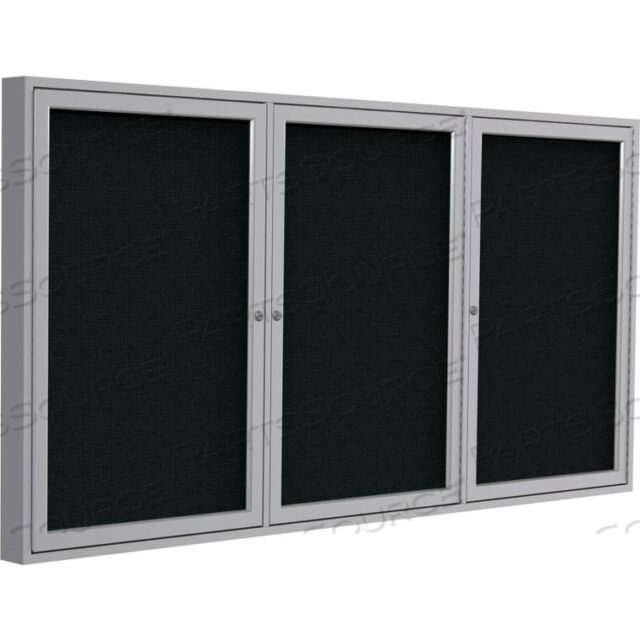 ENCLOSED BULLETIN BOARD — 3 DOOR — BLACK FABRIC W/SILVER FRAME — 36 X 72