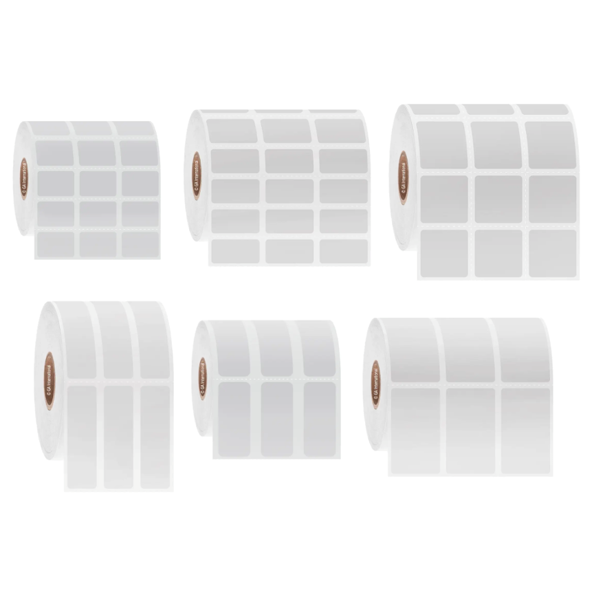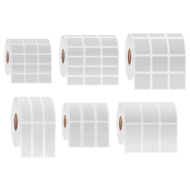 Rectangular labels 3 across a roll in white or multi-colours available on perforated or notched 25.4mm or 76.2mm rolls.