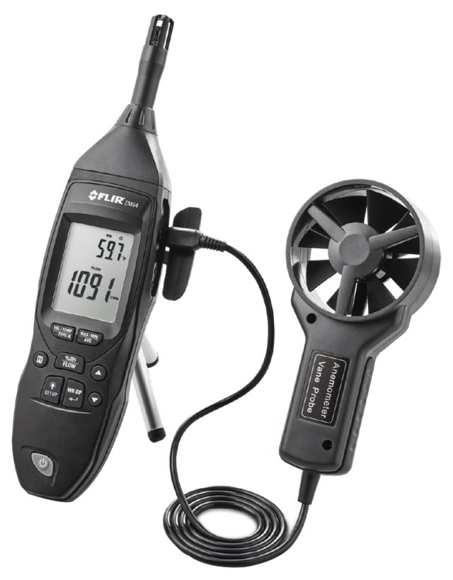 The FLIR EM54 is designed for HVAC/R professionals who need a cost-effective, accurate, and reliable environmental meter. It is ideal for inspecting and troubleshooting ducting systems within residential, commercial, and industrial facilities. The EM54 can help you verify that duct inlets and outlets have the specified volumetric flow – a prerequisite to an efficient functional system. Featuring humidity, wet bulb, and dew point functions, the EM54 can measure deviations from proper relative humidity levels. Plus, the included contact temperature probe is useful to check electric motors and thermal equipment components for proper operating temperatures.