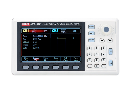 UTG932E от UNI-T — бюджетный 14-битный генератор функций с полосой пропускания 30 МГц. Этот генератор функций использует технологию прямого цифрового синтеза (DDS) для создания стабильных и точных сигналов. Этот генератор функций имеет 24 встроенных сигнала произвольной формы и может хранить до 26.
