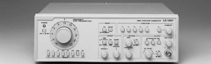 The LG 1301 is a multi-purpose signal source and finds many applications in design/development and education uses. The wide frequency range from 0.002 Hz to 2 MHz coupled with extensive internal and external control of frequency, waveshape and sweep characteristics make the unit ideal for custom test setups and design evaluations. Waveforms include sine, square, triangle, ramp and pulse with 9:1 and 1:9 symmetry range. Both linear and log sweeps are available with 100:1 frequency ranges. Output level is controlled by step attenuators to 70 dB with 10:1 continuous control and DC offset is variable to ± 10V.