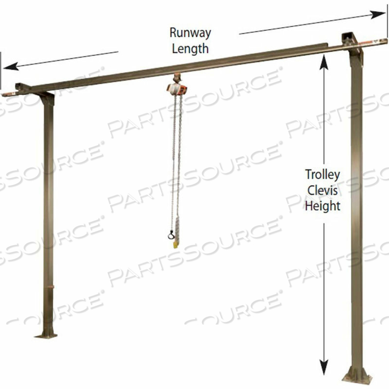 ГРУЗОПОДЪЕМНОСТЬ 250 ФУНТОВ, МОНОРЕЛЬСОВАЯ СИСТЕМА, ДЛИНА ПОЛОСЫ 8, ВЫСОТА СКОБЫ ТЕЛЕЖКИ 12, 2 КОЛОННЫ