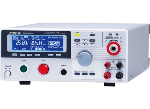 The GPT-9900 series Hi-pot testers from GW Instek are high quality Hi-pot testers. Many functions and a maximum test voltage of 5 kV make these testers a good choice. The devices offer AC/DC withstanding, insulation resistance, ground bond, and arc detection test functionality. The GPT-9900 series is the successor of the GPT-9800 Hi-pot tester and has an increased capacity of 500VA, instead of 200VA on the GPT-9800. The GPT-9900 series also has a Sweep function. The GW Instek GPT-9904 features Hi-pot (AC & DC withstanding), insulation resistance and ground bond tests.