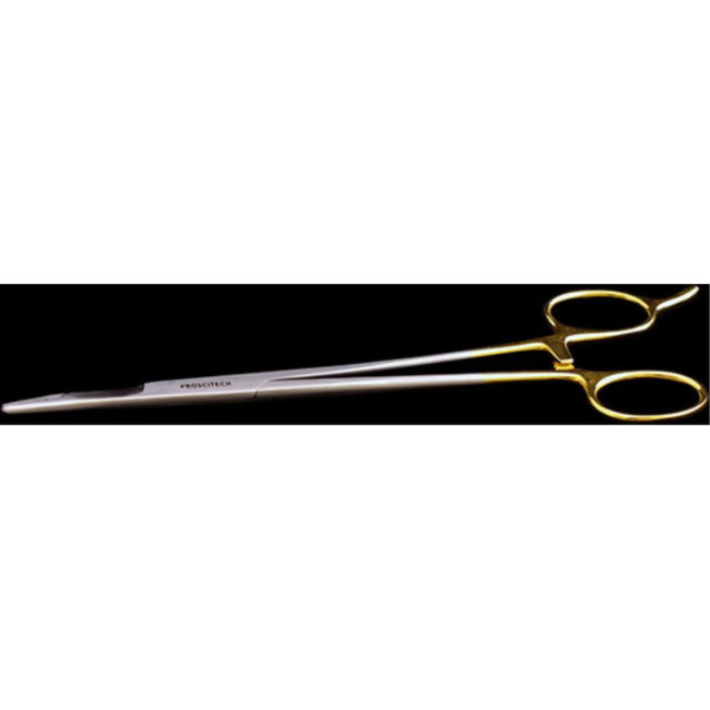 Tungsten carbide Olsen Hegar needle holder used to hold needles while suturing and have a groove for cutting the suture when complete. They have a grip surface tip and ratchet clamp which locks the handles together. These are straight 190mm in length
