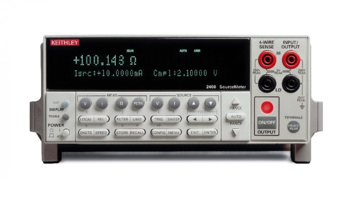 Keithley 2400 разработан специально для тестовых приложений, требующих тесной связи источников и измерений. Все модели источников-измерителей обеспечивают прецизионные источники напряжения и тока, а также возможности измерения. Каждый прибор SourceMeter является одновременно высокостабильным источником питания постоянного тока и 5-1/2-разрядным мультиметром приборного класса. Характеристики источника питания включают низкий уровень шума, точность и возможность считывания.
