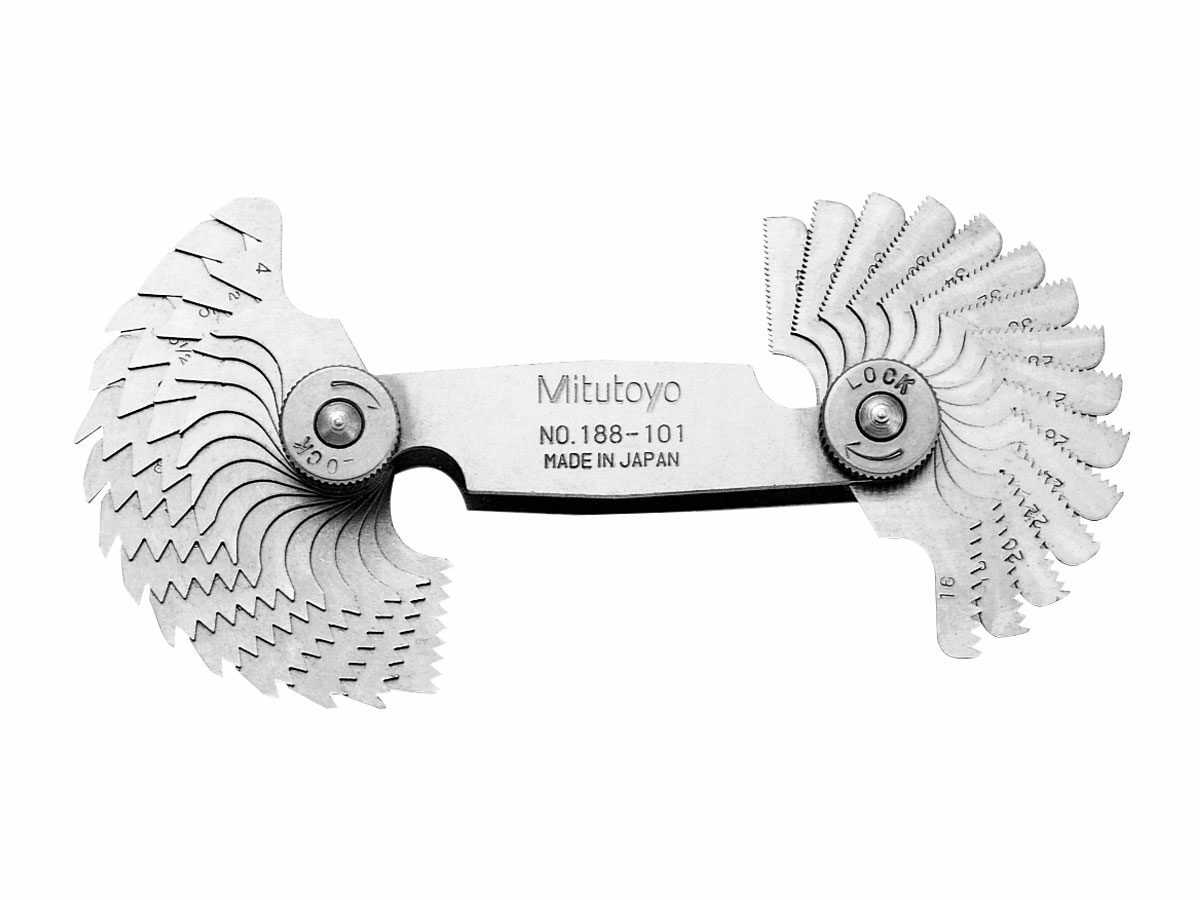 The Mitutoyo screw thread pitch gages are constructed of high-grade stainless steel for reliable and highly accurate thread pitch measurements. Each leaf has the pitch size stamped on it for fast and easy viewing. Locking clamps keep the gages in place while in use or in storage.