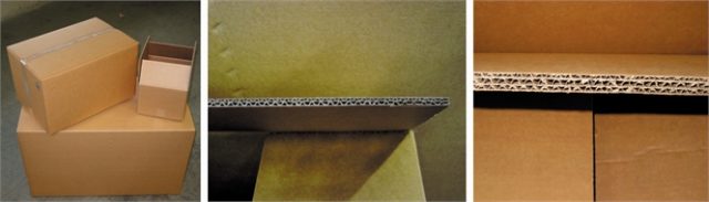 - A cardboard box is made of at least three components: two outer liners of paper plus a central sheet with grooves and ridges (called flute). The flutes range from 0.8 – 1.6 mm (sizes E and F) to 3.2 — 4.8 mm (sizes B and A). Adding fluting sections and paper layers increases the strength of the box. One additional flute layer and liner, makes the box “double walled” or “3 ply”, with a further section, it is called “tri-wall” or “5 ply”. Different combinations of flute sizes between layers are also commonly used to increase both strength and padding.