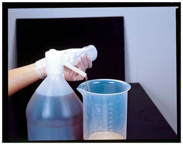 Fits on standard 2.4L (5 pt) acid bottles or 3.8L (1 gal) chemical bottles. Relief valve button on top stops liquid flow from spout. Siphon tube long enough to reach bottom of 2.4L acid bottle.