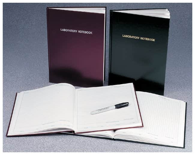 Lab notebooks include 96 permanently sewn-in paper pages with either grid or horizontal ruled lines. Record necessary documentation for securing patent protection. Pages include spaces for dates and signatures. Notebooks include instructions for keeping records, table of contents and a page for issuing contents. The hard cover is waterproof (pages are not).