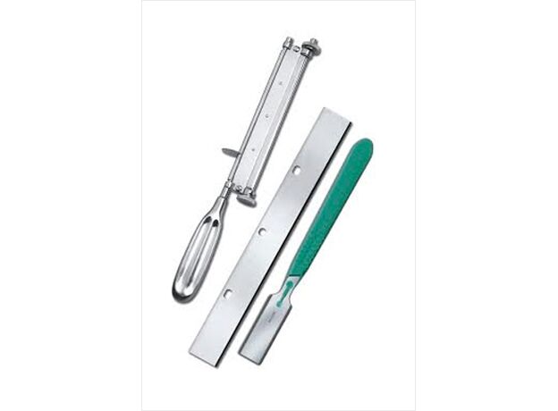 — Состоит из ручки. и стержень, на котором установлен регулируемый ролик для регулировки толщины трансплантата, и держатель лезвия.