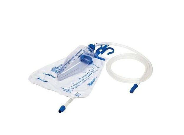 - Мочемер прикрепляется непосредственно к мешку для сбора мочи емкостью два литра с помощью возможность перелива.
