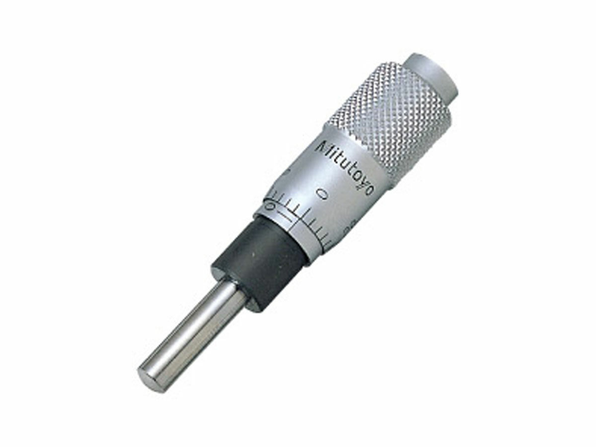 The Mitutoyo micrometer head with fine-feeding spindle is constructed of hardened tool steel, and the measuring face is precision lapped for better accuracy. The thimble extends at a much smaller rate, 0.25mm per revolution, than conventional micrometer heads for more precise positioning and measurement.