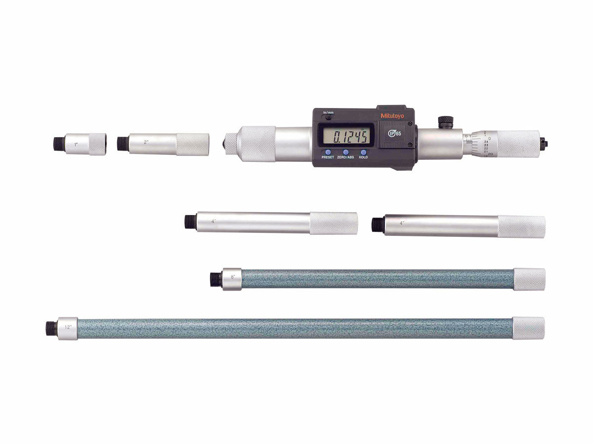 The Mitutoyo Digimatic digital tubular inside micrometer includes a set of solid extension rods to measure a diversified range of inner dimensions of cylinders, rings and parallel surfaces with high accuracy. Measurements are displayed with a resolution to 0.001mm / .0001″ on an easy-to-read LCD readout. The extension rods have knurled collars for easy, secure installation and removal.