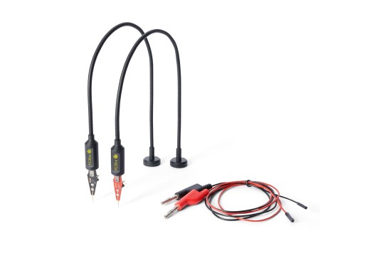 This Sensepeek (4011) product comes with two Sensepeek SP10 (10 MHz probes) and a set of red/black banana cables. The two SP10 probes have different colour heads (red and black) to easily distinguish between the positive and negative connector. The probe has a magnetic base so it stays in position when used on a metal base plate. The banana cables have a 4 mm banana connector on one side and a dupont connector on the other side. Finally, two extra test needles are included as spares.