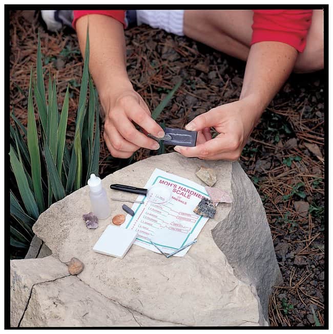 | Includes | Black and white ceramic streak plates, Glass plate, nail, penny, magnet, dropping bottle, magnifying lens, mohs hardness scale chart |