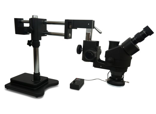 The SM-4TP microscope offers a magnification from 7x to 45x at a maximum working height of 100mm. For use with electronics it is best to use the included barlow lens 0.5x. This halves the magnification of the microscope and doubles the working distance (the distance between the lens and the working platform).