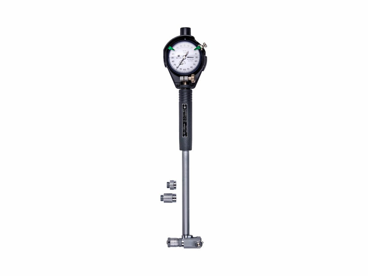 The Mitutoyo bore gage with micrometer head delivers a wide range of bore measurement capabilities for high accuracy at 2µm. Interchangeable anvils made of alloy steel attach to the micrometer head for accurate dimensional setting. The anvils feature a carbide-tipped ball for better measurement reliability and longevity.