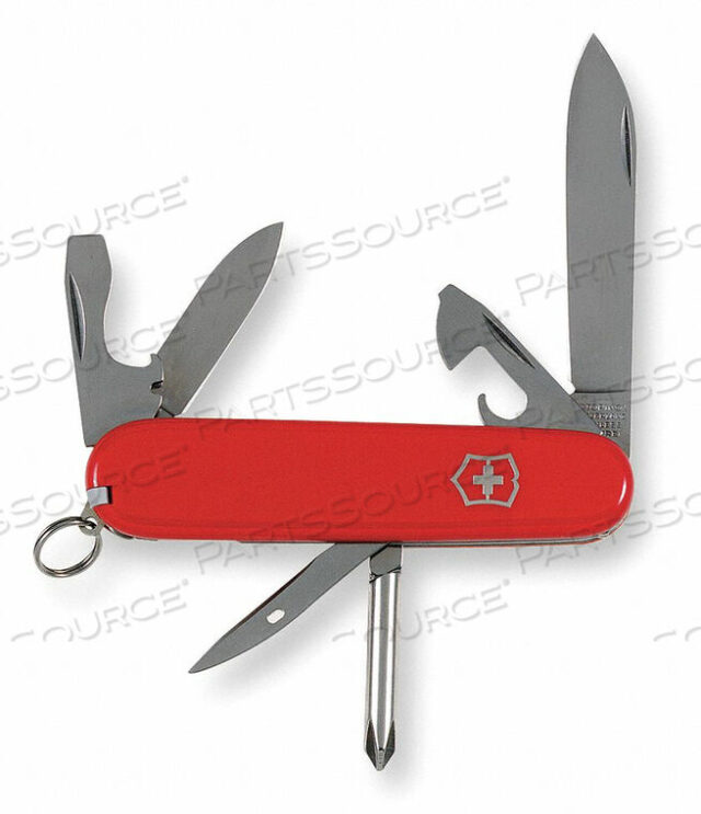 Открывалка для бутылок с большой отверткой и инструментом для зачистки проводов, консервный нож с малой отверткой, кольцо для ключей, большое лезвие, крестовая отвертка, шило с ушком для шитья, малое лезвие, зубочистка, пинцет