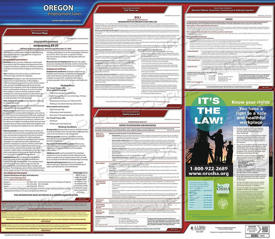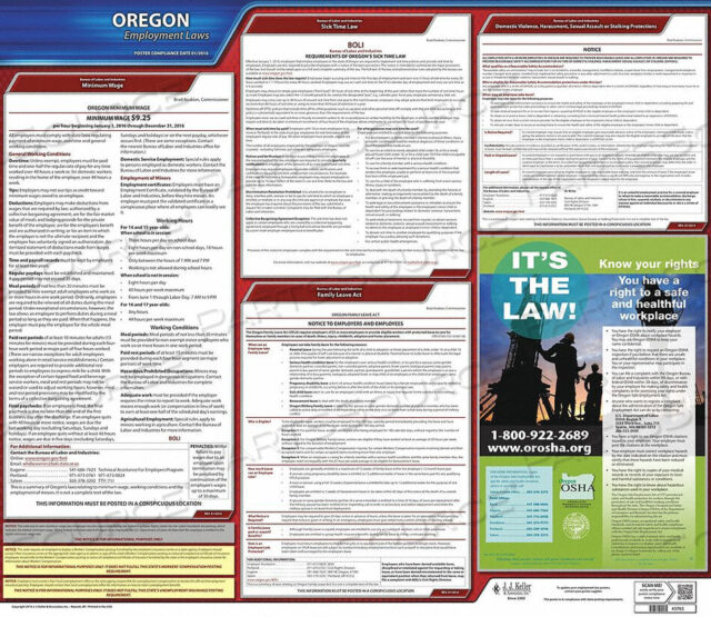 (1) Государственный плакат: Минимальная заработная плата, домашнее насилие, домогательства, охрана здоровья на рабочем месте — это закон! (OROSHA), Закон штата Орегон об отпуске по семейным обстоятельствам (FLA), Безопасность, Защита от сексуального насилия или преследования