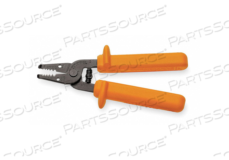This compact, lightweight wire-stripping, cutting tool cuts, strips, loops and gauges 10-18 AWG solid wire. Dual layer orange-over-white insulation protects against electric shock. Exceeds IEC 60900 and ASTM F1505 standards for insulated tools, and are clearly marked with the official 1000-volt rating symbol. Hardened spring steel with precision-ground stripping holes for easy removal of insulation.
