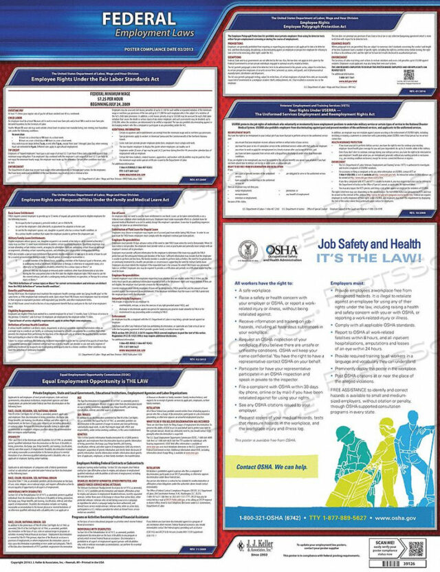 (1) Федеральный плакат: минимум Заработная плата (FLSA), Закон о защите сотрудников от полиграфа (EPPA), Равные возможности трудоустройства — это закон (EEO), Закон об отпуске по семейным и медицинским причинам (FMLA), Безопасность и гигиена труда — это закон (OSHA 3165), Закон о трудоустройстве и повторной занятости военнослужащих (USERRA)