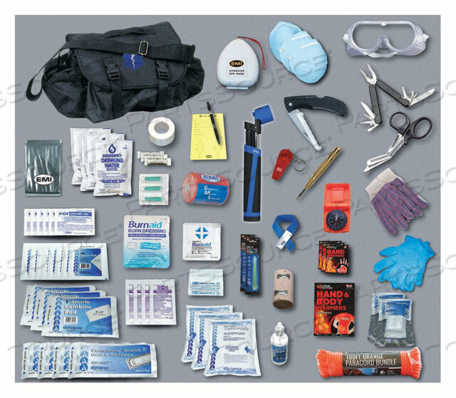 фонарик Star Power Illuminator, (3) пылезащитные маски, инструмент 11 в 1, защитные очки, пара перчаток, ножницы для оказания неотложной помощи, спасательный нож, дырокол для окон, (10) 1 x 3 дюйма Пластыри, (3) прокладки 5 дюймов x 9 дюймов, (8) стерильные прокладки 4 дюйма x 4 дюйма, повязка для ожогов 8 дюймов x 8 дюймов, повязка для ожогов 4 дюйма x 4 дюйма, (4) 3