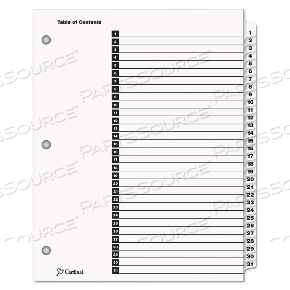ОДНОШТАТНАЯ ПЕЧАТНАЯ ТАБЛИЦА СОДЕРЖАНИЯ И РАЗДЕЛИТЕЛЕЙ, 31 ВКЛАДКА, 1 ДО 31, 11 X 8,5, БЕЛЫЙ, БЕЛЫЕ ВКЛАДКИ, 1 КОМПЛЕКТ