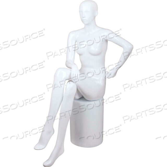 ЖЕНСКИЙ МАНЕКЕН — СИДЯЩИЙ, СКРЕСТИВ НОГИ, ВКЛЮЧЕН СТУЛЬЧИК — ГЛЯНЦЕВАЯ ОТДЕЛКА, БЕЛЫЙ