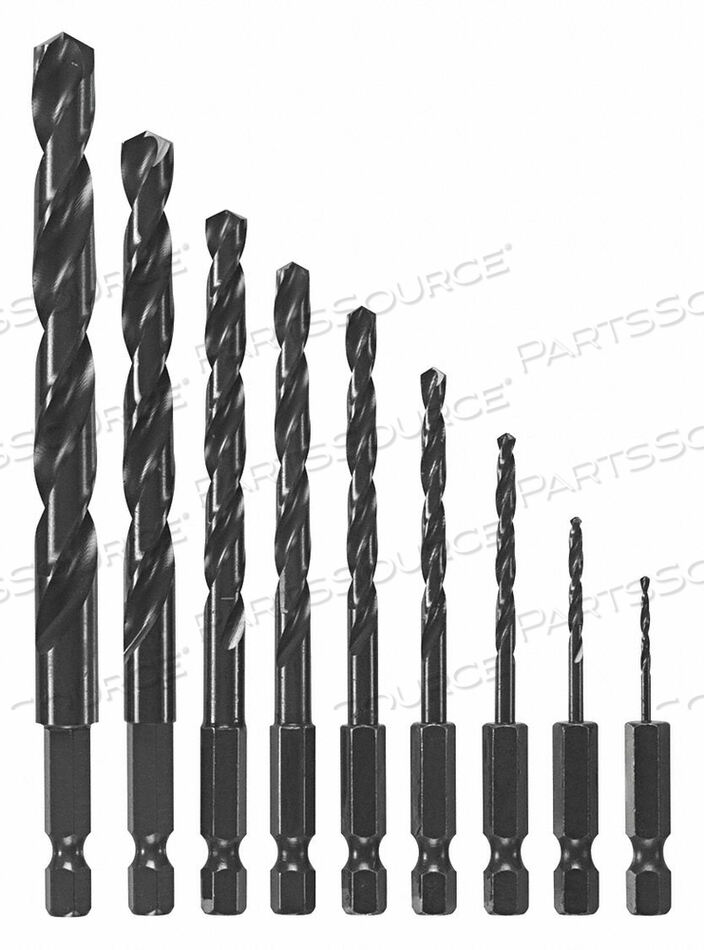 (1) Сверло 1/16 дюйма, (1 ) Сверло 3/32 дюйма, (1) Сверло 1/8 дюйма, (1) Сверло 5/32 дюйма, (1) Сверло 3/16 дюйма, (1) Сверло 7/32 дюйма, (1 ) Сверло 1/4 дюйма, (1) Сверло 5/16 дюйма, (1) Сверло 3/8 дюйма