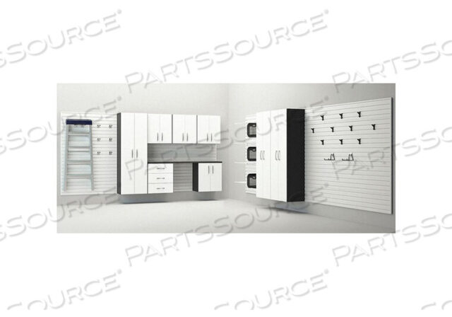 (12) 12 in x 96 in Slatwall Panels, (18) 12 in x 48 in Slatwall Panels, (19) Hooks, (3) 21-1/2 in x 6-1/4 in x 15 in Drawers, (3) 24 in H x 12 in W x 10 in D Nylon Bins, 24 in x 12 in Shelves, Hardware