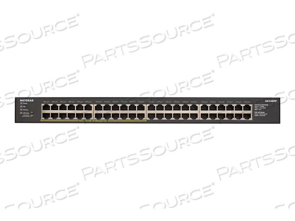 Представляем NETGEAR GS348PP 48-портовый гигабитный Ethernet неуправляемый коммутатор PoE+ с бюджетом PoE 380 Вт и 24 портами PoE+. GS348PP — это экономичный и мощный коммутатор с наилучшим соотношением цена/бюджет PoE. Тихая конструкция делает GS348PP идеальным экономичным и перспективным вариантом для любого бизнеса или дома. Настольный и стоечный для гибкого размещения. Что в коробке: NETGEAR GS348PP, резиновые ножки, комплект для монтажа в стойку