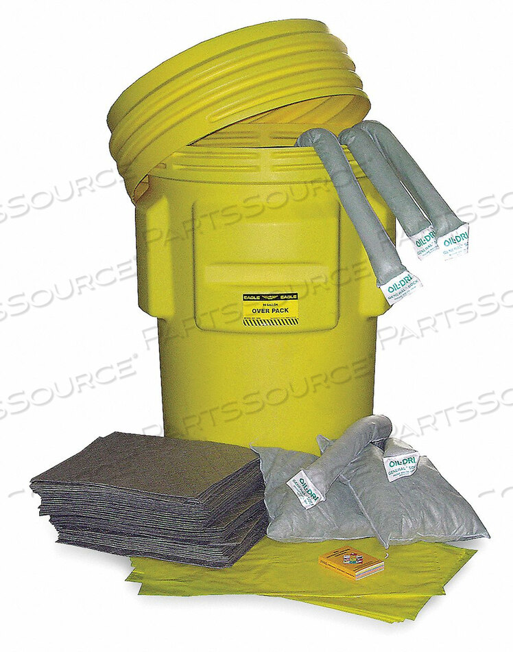 (1) 95-галлонный внешний пакет, (1) Руководство по реагированию на чрезвычайные ситуации, (1) Пара перчаток, (1) Пара защитных очков, (10) 120-дюймовые универсальные носки, (10) мусорные пакеты с завязками, (150) универсальных прокладок, (16) универсальных носков 48 дюймов, (8) универсальных подушек
