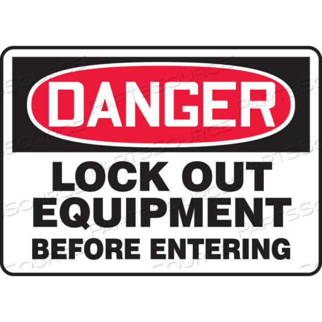 ЗНАК ОПАСНОСТИ, ОБОРУДОВАНИЕ БЛОКИРОВКИ ПЕРЕД ВХОДОМ, 10 Ш X 7 В, АЛЮМИНИЙ