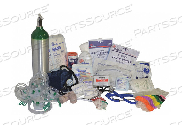 (1) 6×8- холодных компрессов, (1) набор для измерения АД/стетоскопа: (1) стетоскоп Sprague и (1) для измерения артериального давления у взрослых, (1) набор для измерения орального давления Berman, (1) ножницы для скорой медицинской помощи — 7-1/4 дюйма, (1) эластичные бинты — 4×5 ярдов, (1) майларовое одеяло для экстренной помощи 52 дюйма x 82 дюйма, (1) пустой баллон O2 D-tank, (1) фонарик, (1) эластичный